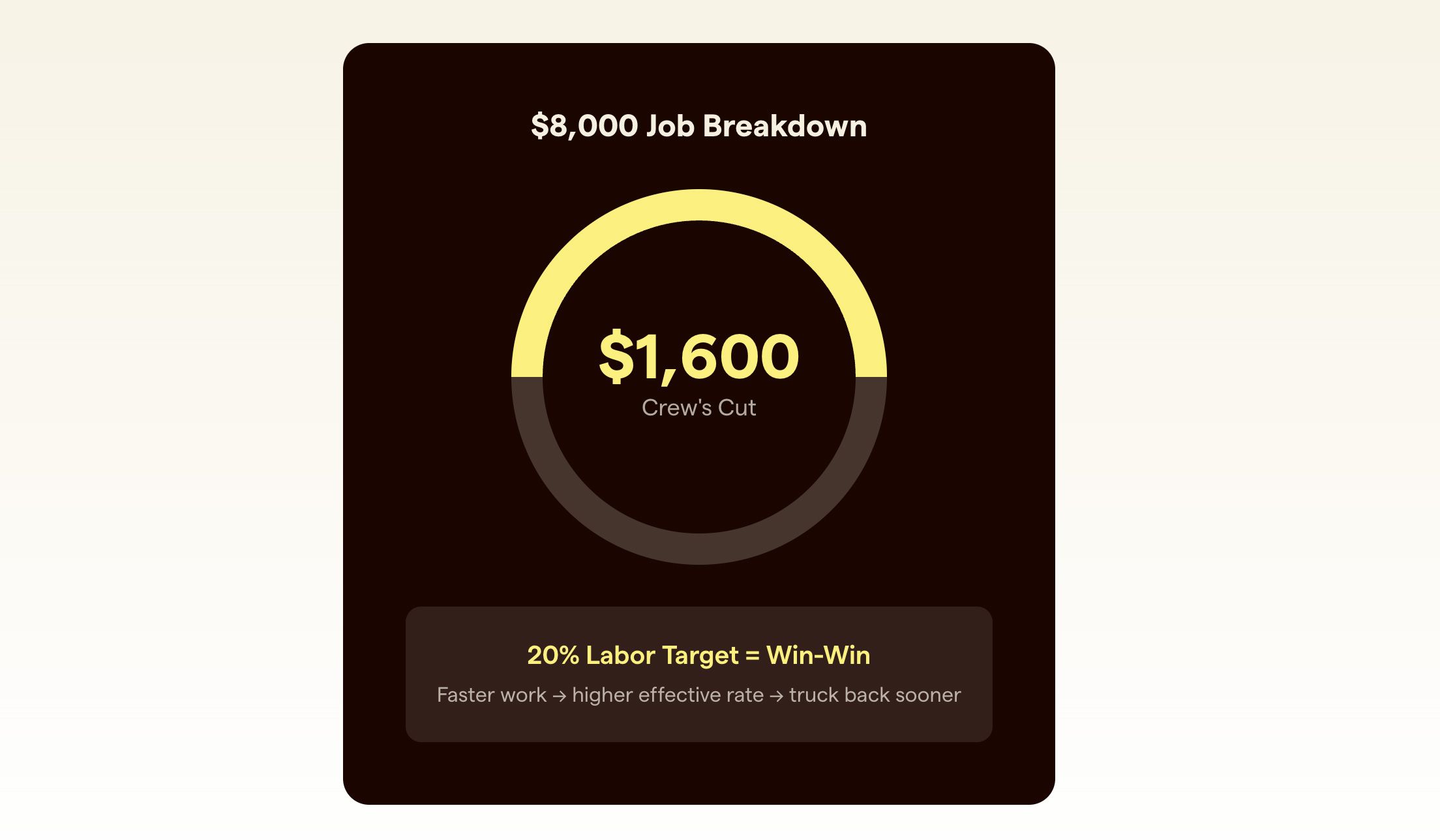 If you sell an $8,000 job, your target labor cost is roughly $1,600. If your crew drags that job out over three days on an hourly rate, your margins shrink.